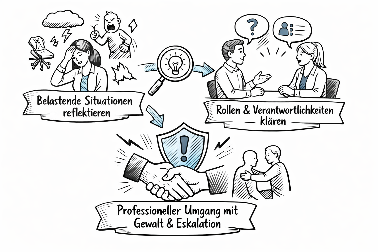 Ich unterstütze Fachkräfte dabei, belastende Situationen zu reflektieren, Rollen und Verantwortlichkeiten zu klären und einen professionellen Umgang mit Gewalt- und Eskalationserfahrungen zu entwickeln.
